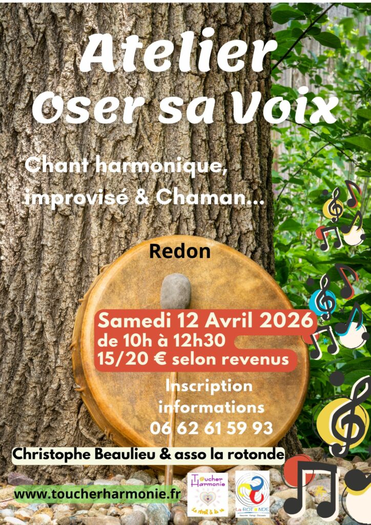 Un atelier pour expérimenter l’écoute des harmoniques, le chant spontané, les chants sacrés et chamaniques, la voix libérée… Une ouverture des centres résonateurs du corps, des exercices d’échauffement, des massages… Un moment de connexion avec les tambours pour vibrer à l’unisson et laisser s’exprimer sa voie et son souffle. Tout simplement explorer les potentialités de sa voix, découvrir & partager son chant » On ne peut oser qu’à partir du moment où l’on observe et ressens ce qui nous entrave et nous bloque dans nos fonctionnements. » F. Leguy